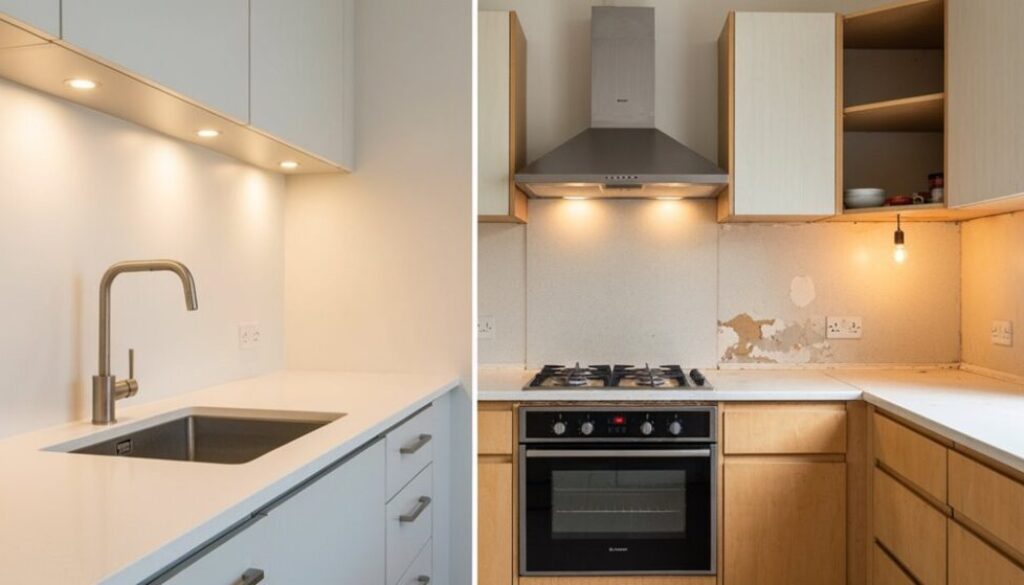 Vermeiden Sie extravagante Oberflächen, die die Anschaffungs- oder Austauschkosten erhöhen, ohne die Funktionalität zu verbessern: ultra‑hochglänzender Lack, maßgefertigte Tischlerei mit nicht standardisierten Abmessungen oder importierter Stein mit empfindlicher Aderung erhöhen Wartung und Ausfallzeiten bei Reparaturen, erschweren künftige Mieterwechsel und treiben Versicherungs‑ und Ersatzkosten in die Höhe. Die pragmatische Bewertung bevorzugt robuste, leicht auszutauschende Elemente gegenüber Schaustück‑Ästhetik, die im Alltag kaum nützt. Marmor‑Spritzschutzwände wirken hochwertig, platzen und verfärben sich jedoch und müssen versiegelt werden; dekorative Zierleisten sammeln Fett und erschweren das Überstreichen; Kunsthandwerksbeleuchtung benötigt oft spezielle Leuchtmittel und Befestigungen; offene Regale setzen Geschirr Staub und Schmutz aus; Glastüren an Schränken zeigen jeden Fingerabdruck und erfordern häufigere Pflege. Vermieter und Verwalter sollten die anfängliche Attraktivität gegen Lebenszykluskosten, Verfügbarkeit von Ersatzteilen und Vertrautheit der Handwerker abwägen. Priorisieren Sie Oberflächen, die Abnutzung vertragen, modularen Austausch erlauben und standardisierte Abmessungen verwenden, um Leerstandszeiten und Kosten zu reduzieren.